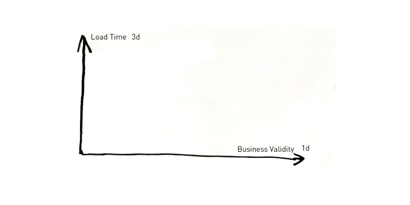 1d axis: All information is valid but only one entry is current. The second dimension (2d) is the inscription time in the source system. This is relevant because on the 1d axis you can also enter new entries for the future and corrections for the current time slice and/or the past. In certain industries and departments, this can be used to commit fraud. As an example, sales commissions can be obtained by recording and subsequently deleting contracts that do not really exist. Thus, this timeline can be crucial for auditing and fraud prevention. For normal reporting, it can often be disregarded - especially if the third time axis is not very far from this second time axis (e.g. through daily or even intraday loads). And this is also the reason for the first simplification: I suggest to store the 2d timeline in a satellite simply as an attribute in a first step so that no information is lost and later special analysis is possible if necessary. But in this text, I will not deal with this case explicitly. *** 1st simplification / strategy : store the 2d times as normal satellite attribute*** It means that from the 3-dimensional space we only consider a 2-dimensional plane: