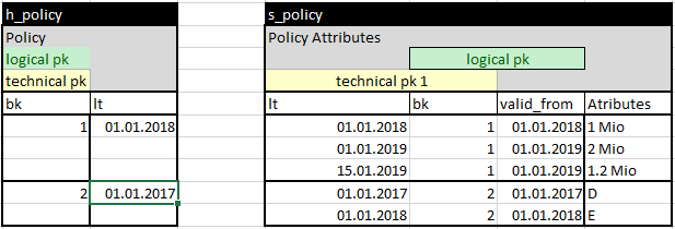 There are some basic differences: do I interpret the time before loading it into the Data Vault (see also the good works and courses by Dirk Lerner) or do I first load everything coming from the source into the Raw Vault, even if we get overlapping time slices. We have chosen the second approach because traceability in the vault itself for us is only given when we can capture all data, however wrong it may be. *** 2nd “simplification”/ strategy: create a temporal instance hub ****** by concatenating the business key with the business valid from time*** This means that we receive several valid entries for a business key, such as a contract number, even if they are not current. We thus receive several tuples with descriptive attributes for the same business key. In the Data Vault pattern, a satellite can store exactly one tuple for a business key during a load. This is confusing in that it can have multiple tuples over time. But these tuples represent the 3d history - not the 1d history where there are several valid tuples at the same time. The solution is either to use a so-called Multi-Active Satellite (MA Satellite, also called Multi Valued Satellite - some modellers may call it explicitly a Bi-Temporal Satellite) or to change the grain of the hub. I call this a temporal instance hub. Both approaches have a for and against. The MA Satellite makes the model leaner from the point of view that no special hub for a bi-temporal version of the object needs to be introduced. The drawback is that I can no longer reference a specific instance of the object in the model. *4